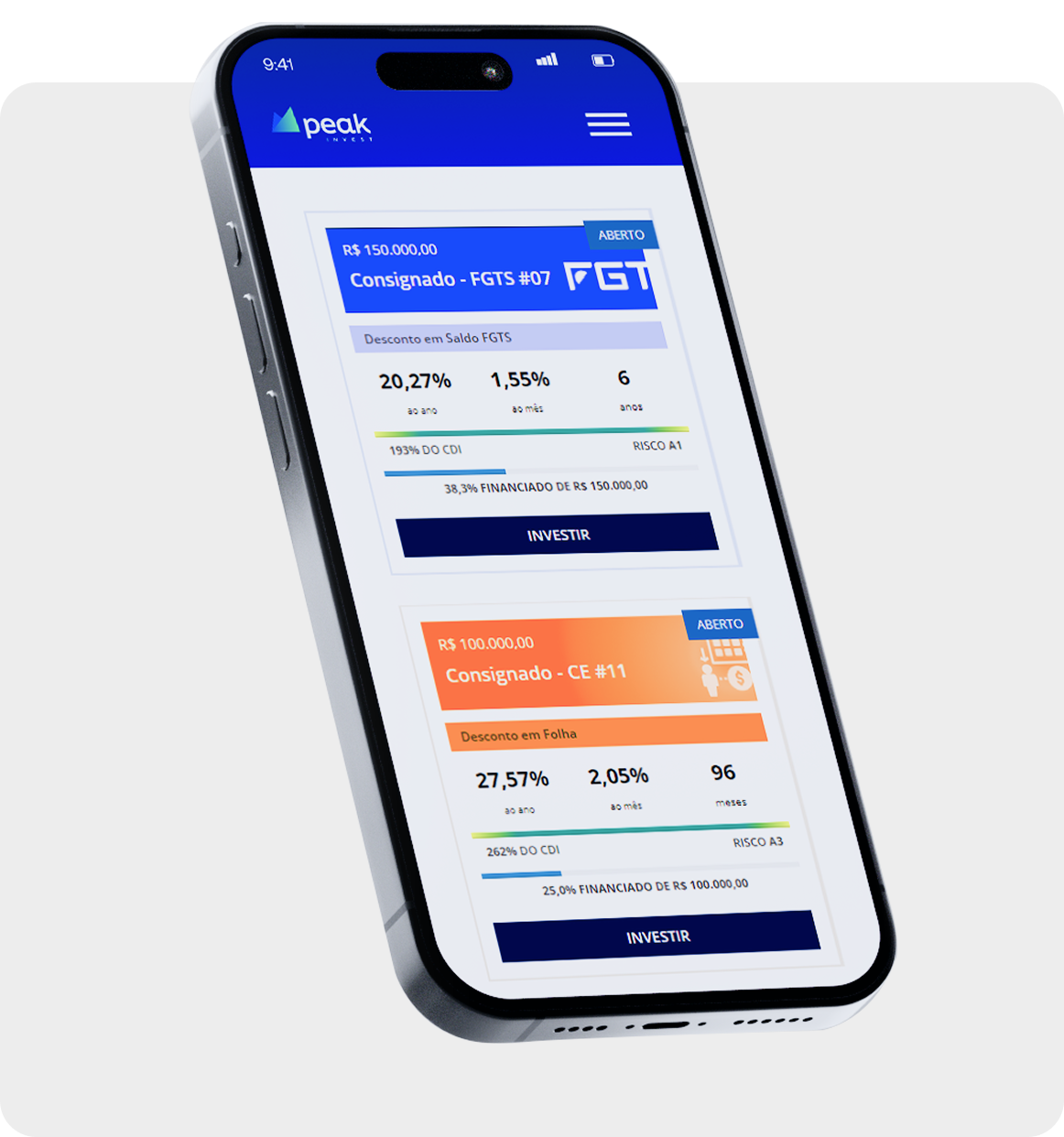 A Peak também atua diretamente na intermediação financeira de empréstimos entre pessoas, por meio da Peak Sociedade de Empréstimo Entre Pessoas S.A. (CNPJ: 44.019.481/0001-52), instituição financeira autorizada a intermediar empréstimos entre pessoas pelo Banco Central do Brasil, nos termos do artigo 8º e seguintes da Resolução CMN nº 5050/2022. Informações adicionais aplicáveis a todas as modalidades de concessão de crédito a partir da plataforma da Peak: Prazo de pagamento: De 2 a 36 meses. Custo Efetivo Total: CET mínimo de 2,04% e máximo de 14,76% ao mês (27,42% a 421,78% ao ano). Exemplo ilustrativo: Suponha empréstimo de R$ 100.000,00, para pagar em 2 anos (24 meses) e CET de 2,20% ao mês (29,79% ao ano). Total 24 parcelas de R$ 5.079,82. Valor total a pagar igual a R$ 121.915,68. Em concordância com a regulamentação do Banco Central do Brasil, a inadimplência acima de 90 dias dos últimos 12 meses está em 1,89% (Maio 2023).
